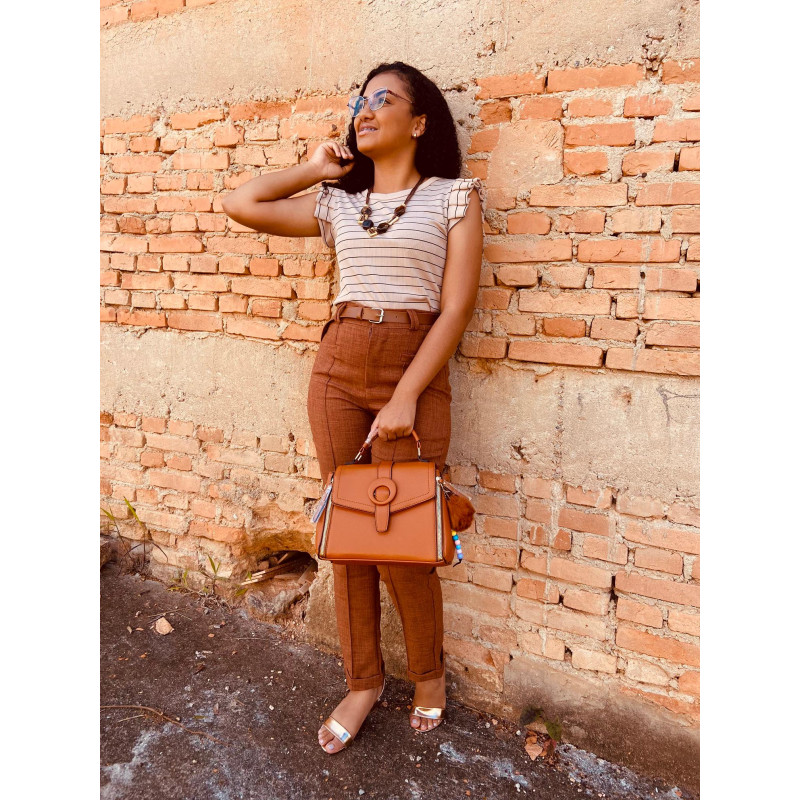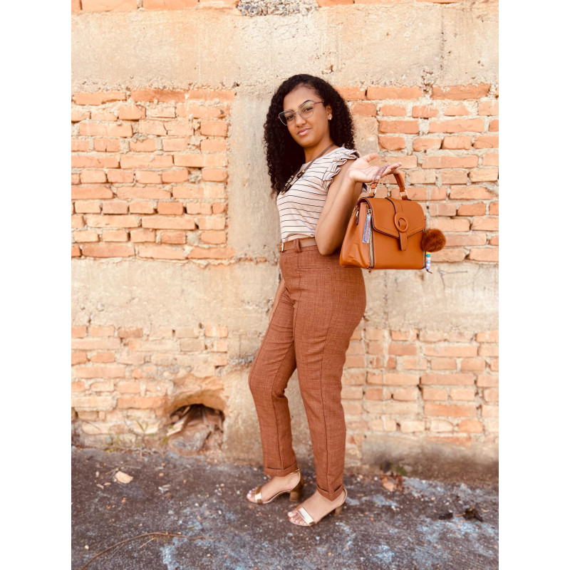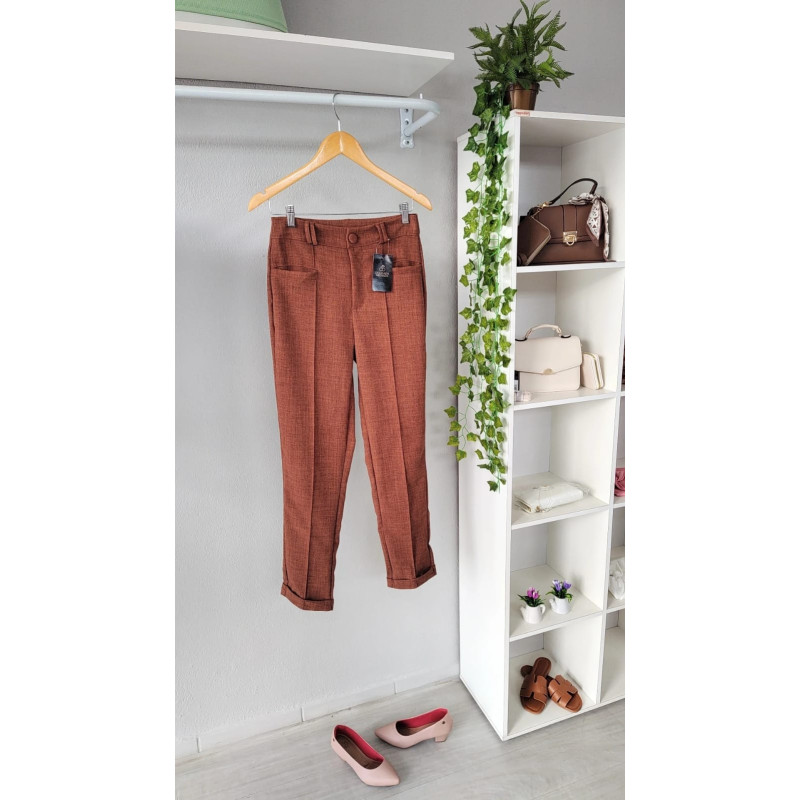 Calça alfaiataria com costura francesa e barra italiana, bolsos frontais, zíper e botão encapado.