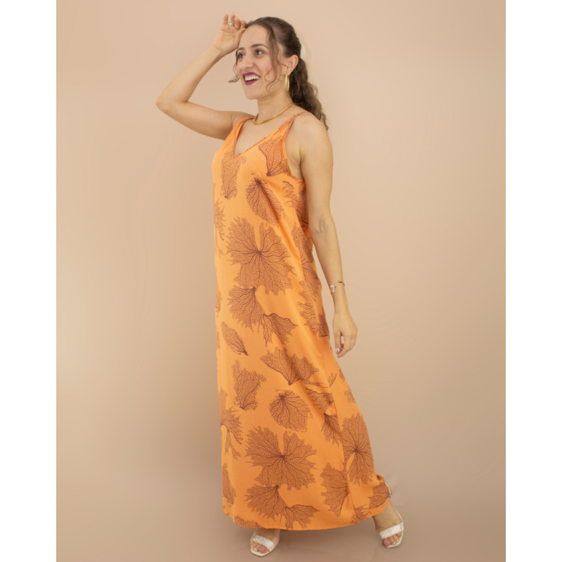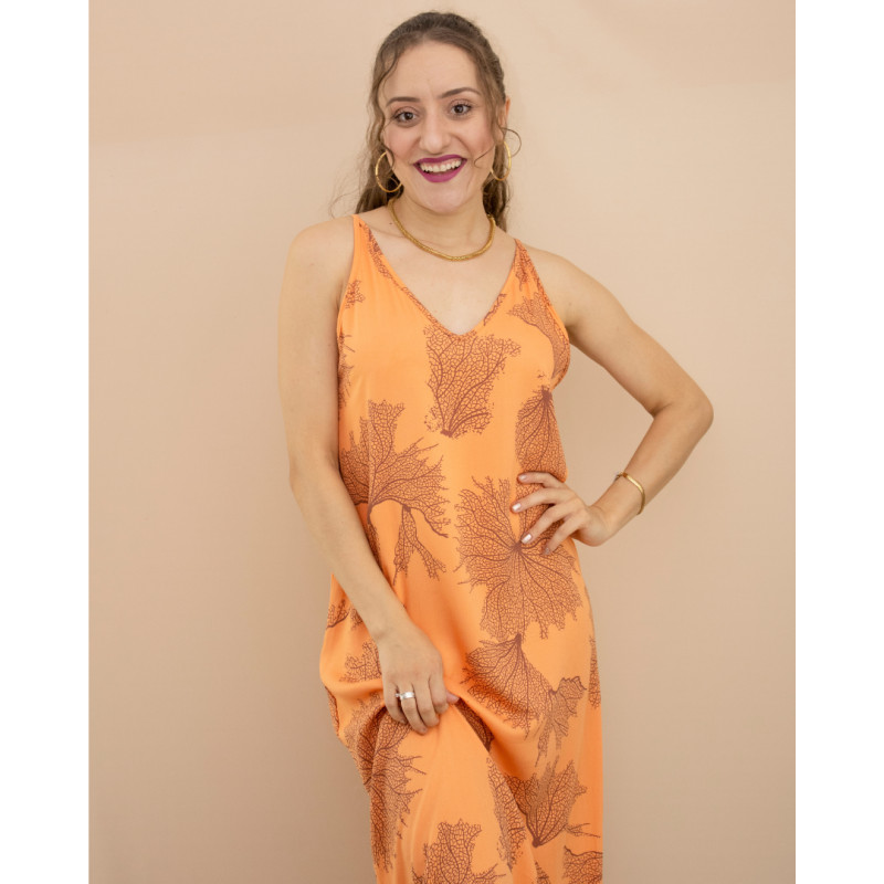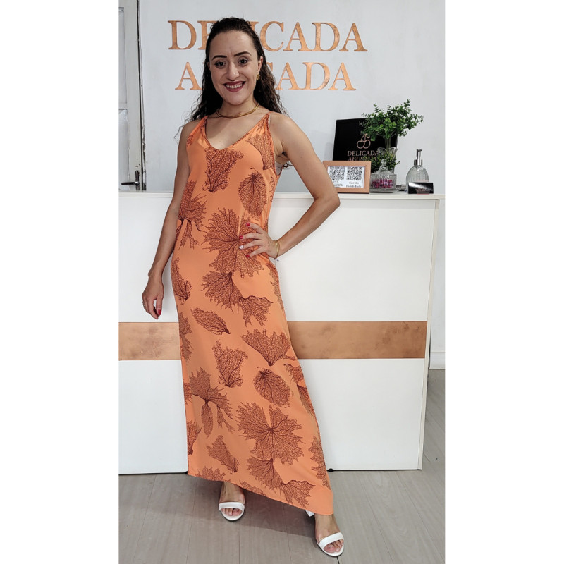 Longo com modelagem mais reta, alças finas e decote V com braços bem cavados.
